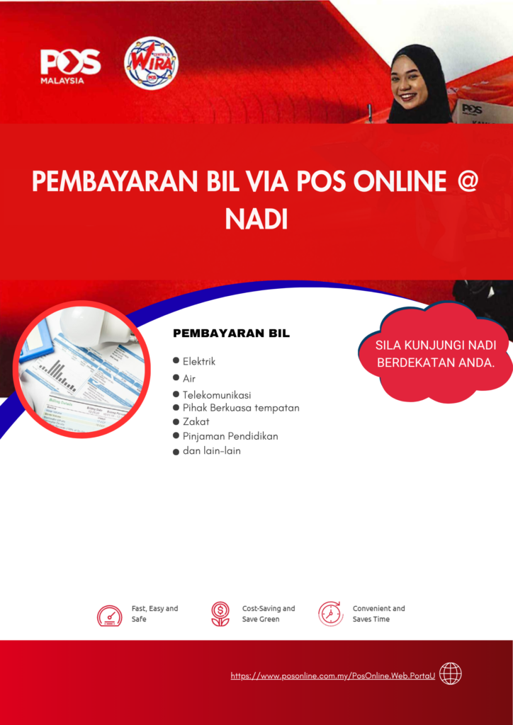 NADI menyediakan perkhidmatan pembayaran pelbagai bil secara atas talian melalui Portal ePerkhidmatan Pos Malaysia.